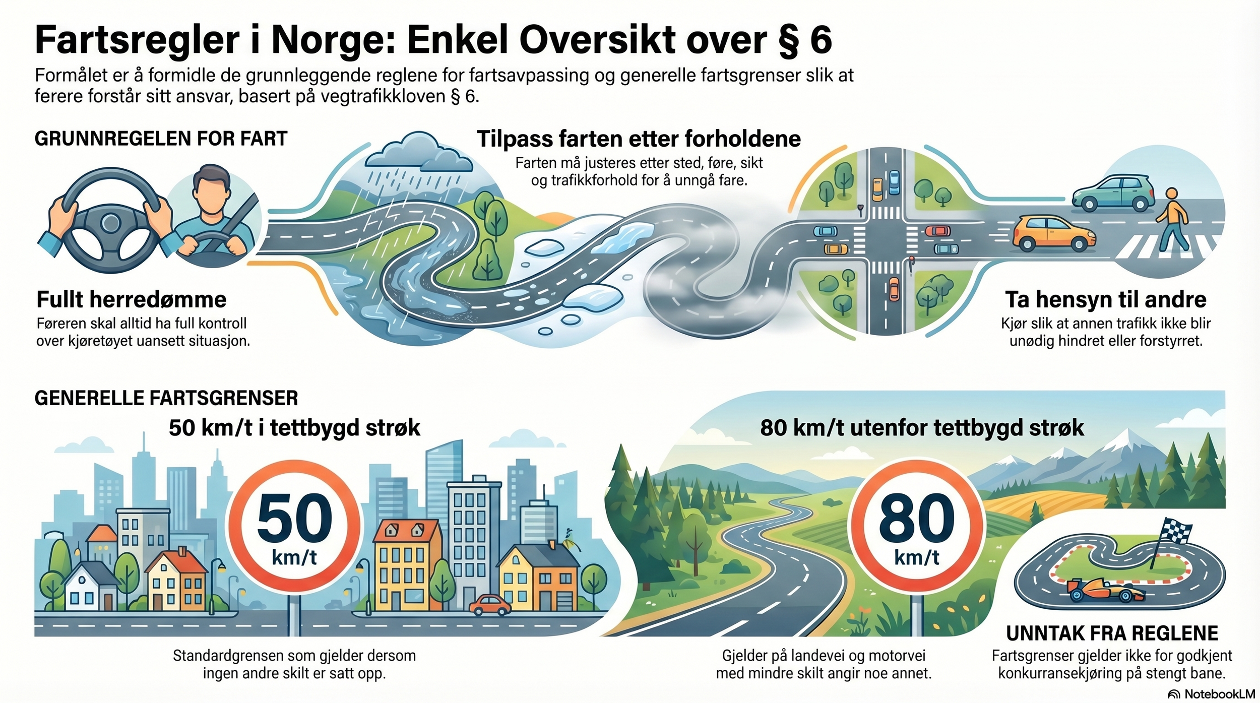Fører av kjøretøy skal avpasse farten etter sted, føre-, sikt- og trafikkforholdene slik at det ikke kan oppstå fare eller voldes ulempe for andre, og slik at annen trafikk blir minst mulig hindret eller forstyrret. Føreren skal alltid ha fullt herredømme over kjøretøyet.